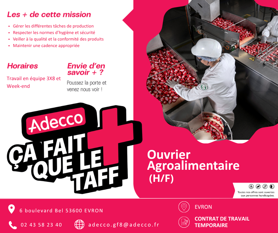 Adecco recrute pour l’un de ses clients basé à Evron un(e) Ouvrier agroalimentaire (H/F). Vous intervenez au sein d’une unité de production industrielle et participez à la fabrication et au conditionnement de produits alimentaires.